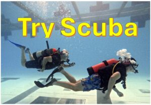 This is your chance to try SCUBA without signing up for class. Spend an hour diving in a large, deep, indoor heated pool. If you decide you like SCUBA and sign up the same day, you may deduct the $50 from your SCUBA certification price. Pay with check or cash at pool to receive $50 deduction. I’ll even bring an underwater camera so you may take pictures of yourself and friends.